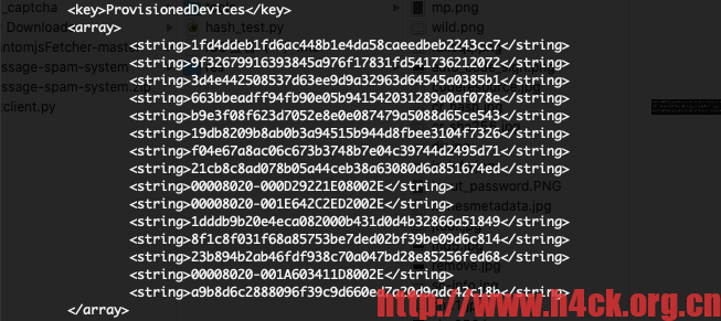 该列表定义了那些设备可以安装签名后的ipa文件,对应的数据内容为设备的uuid,获取uuid主要有两种方法,1:使用各种助手,2:通过安装设备描述文件。具体的实现方法感兴趣可以自己搜索。 如果不在该列表内,那么签名后的ipa是无法安装的。
